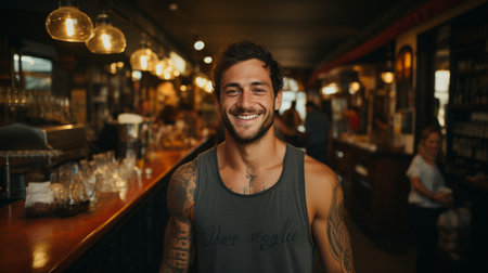 Beautiful girl barista at coffee shop with flawless skin, tattoos on her breast, and tank top. GENERATE AI