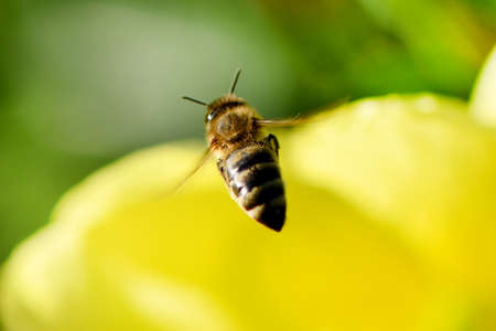 Bee in flight on a flower, honey bee. High resolution photo. Selective focus. Shallow depth of field.