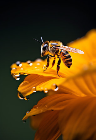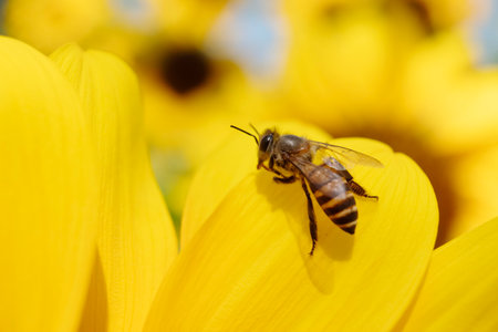 A diligent honeybee at work, closeup on a vibrant yellow flower