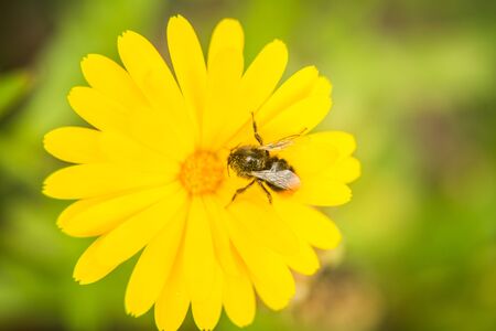 Wild bee close up on yellow dandelion in the green field. flowers in nature.
