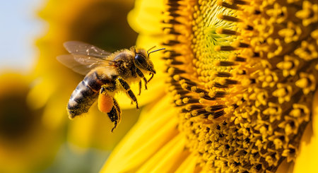 In a close-up view, a honeybee flits among the petals of a radiant sunflower, gathering golden pollen under the warm sun, showing nature's intricate details and beauty.