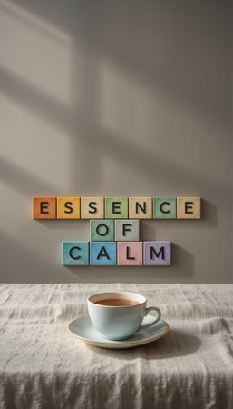 A tranquil scene featuring a light blue coffee cup on a textured surface, surrounded by colorful tiles spelling ESSENCE OF CALM, evoking peace and serenity.