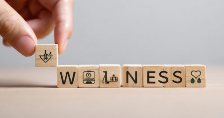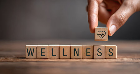 A hand places a wooden block with a graphic atop blocks spelling 'wellness'. The composition showcases natural wood tones and soft lighting. This image could be used for articles, advertising, or educational materials related to health and lifestyle, highlighting concepts of self-care and well-being.