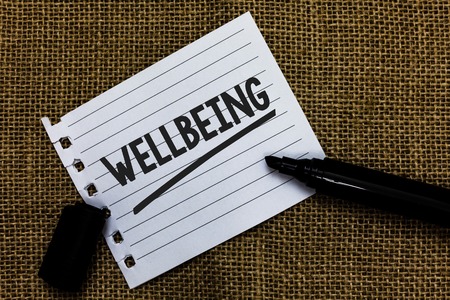 Writing note showing Wellbeing. Business photo showcasing Healthy lifestyle conditions of people life work balance Ideas paper marker pens important inspiration memories love thoughts