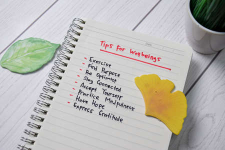 Tips for Wellbeings write on a book. Supported by an additional services isolated wooden table.