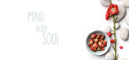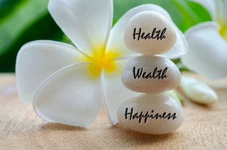 Health, Wealth and Happiness text on white zen stones with beautiful white flower background.