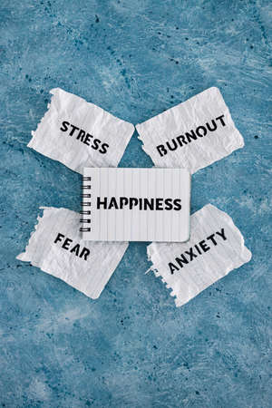 Happiness text on notepad with Fear Anxiety Stress and Burnout words on torn scrunched up pages, psychology and omental health concept