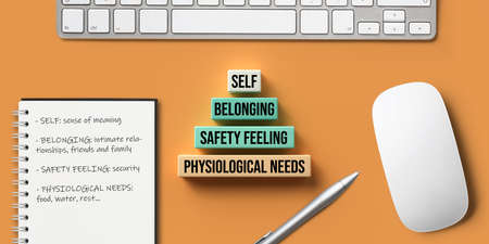 hierarchy of needs on wooden blocks at a workplace on orange background