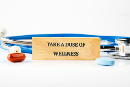 The concept phrase is TAKE A DOSE OF WELLNESS. Health concept. Pharmacological preparations, medicinal products.