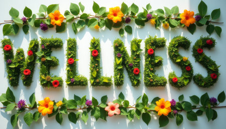 The word WELLNESS is creatively crafted from lush green foliage and adorned with colorful flowers, set against a bright background. This lively composition radiates positivity and vitality, inviting viewers to embrace a healthy and balanced lifestyle.