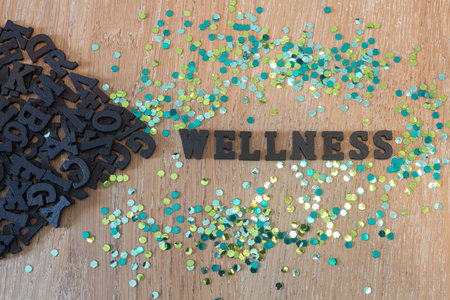 Wellness text on a wooden cubes on a brown cork background, copy space below