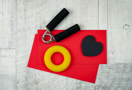 Fitness expanders, red envelopes and black heart on gray wooden background. Love and sport concept, brutal style. Top view