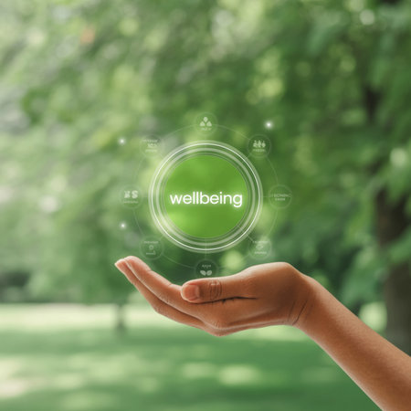 A hand displays a green 'Wellbeing' circle with icons for health, family, community, and nature, against a green background. It represents holistic wellness, emphasizing balance and interconnectedness for a better life.