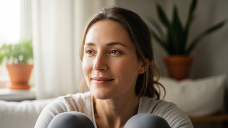 A woman with a gentle smile sits comfortably in a well-lit room with plants in the background.