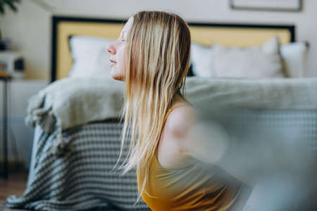 Young woman does exercises near bed with pillows and blanket