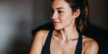 A woman is sitting in a dark room, wearing a tank top and glancing to the side. Light from a window highlights her face. She shows a slight smile as she enjoys the moment.