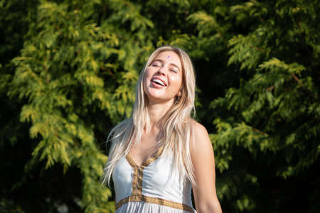 A beautiful young blond woman with long curly hair wearing a dress poses near trees