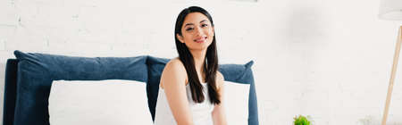 Panoramic shot of smiling asian woman looking at camera in bedroom