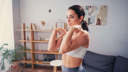 Pretty sportswoman warming up in living room