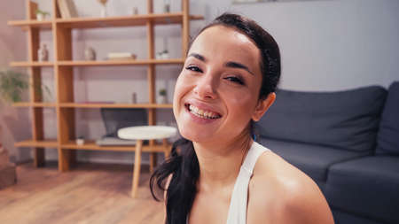 Brunette woman smiling at camera at home
