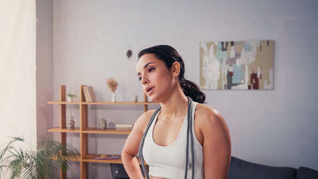 Exhausted sportswoman with jump rope standing in living room