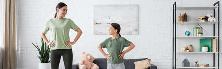 child and babysitter training with hands on hips and smiling at each other, banner