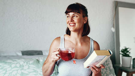 Good books capture the imagination. Shot of an attractive young woman drinking tea and reading a book in her bedroom at home.