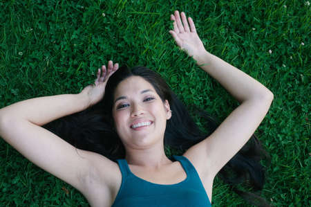 portrait of an attractive Asian woman lying in grass