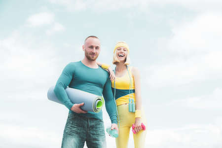 Loving couple doing fitness at fresh air outdoors. Successful teamwork at blue sky background. Beautiful cheerful smiling woman workout with her sport coach.