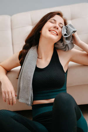 Young woman in sports clothes wipes her sweat with a towel after an intensive fitness at home. Concept of sports and weight loss.