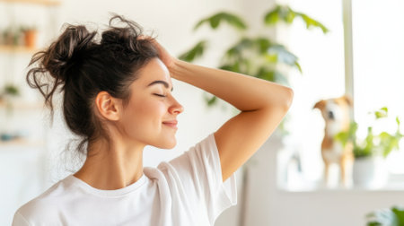 Young woman relaxing on sofa in bright living room surrounded by plants, AI generated