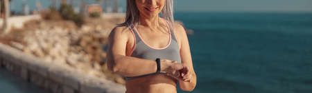 Female runner checking time on wristwatch