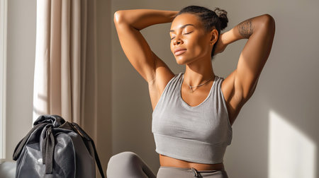 Fit woman basking in sun rays, relaxing muscles after an intense workout, embracing a healthy lifestyle and promoting overall wellness