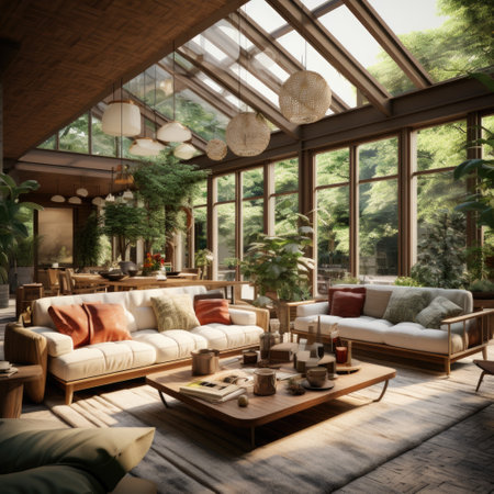 A Modern eco conscious living room with natural light and greenery