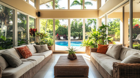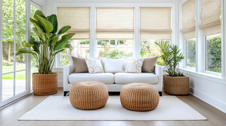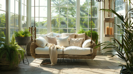 Bright and airy sunroom with wicker furniture and indoor plants. Generative AI technology