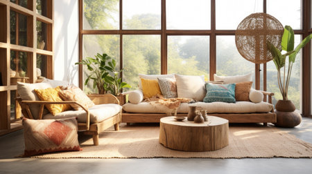 Boho style interior design of modern living room with rustic furniture near window