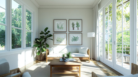 A beautifully lit living room that features large windows, stylish furniture, and plant decor, creating a tranquil atmosphere. Ideal for modern home aesthetics.