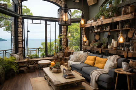 Cozy living room interior with sofa, coffee table, coffee shop and sea view