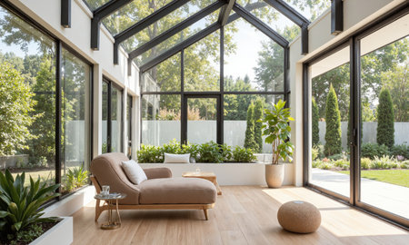 A contemporary sunroom with floor-to-ceiling glass windows, letting in an abundance of natural light. The room is furnished with a mocha mousse-colored velvet