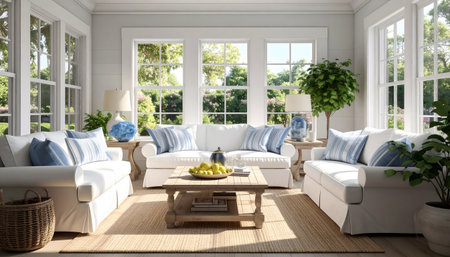 Bright, light-drenched sunroom embodying the 'Coastal Grandmother' aesthetic with white slipcovered sofas, blue accents, and large windows