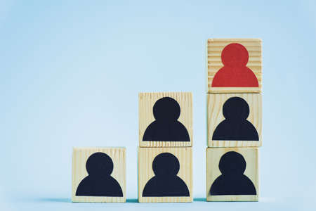 pyramid of wooden blocks with black and red human icons on blue background, leadership concept