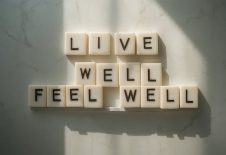 A visually appealing arrangement of letters spelling Live Well Feel Well on a marble surface, capturing a theme of wellness and positivity with soft lighting.