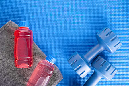 Protein shake and dumbbells. Close up.