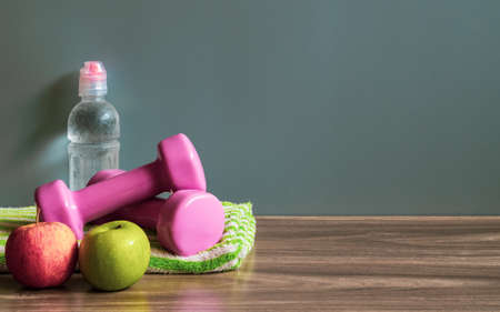 Healthy and active lifestyle background concept. Green and Red Apples, Dumbbells and bottle of water on wood floor with copy space.