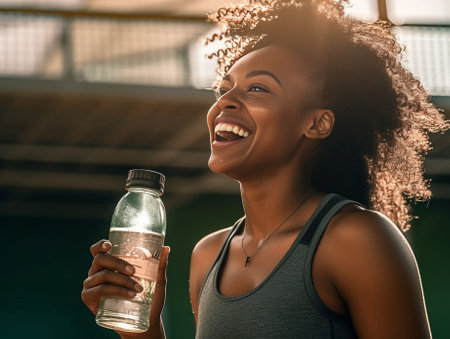 Joyful glad woman looks happily aside poses with towel on shoulders drinks fresh water after exhausting exercising takes break has dehydration of body Athletic Afro girl : Generative AI