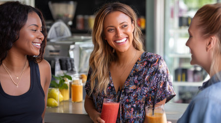 A woman with obesity enjoying a healthy smoothie with friends at a local juice bar.
