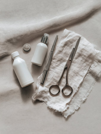 A curated selection of beauty products and surgical tools is neatly placed on a soft neutral cloth, showing a blend of aesthetics and functionality.