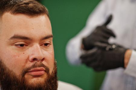 Handsome bearded man at the barbershop, barber at work.