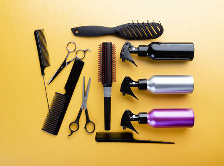 Hairdresser set with different tools on yellow background. Professional equipment for haircut isolated, top view. Hair combs, scissors and sprayers