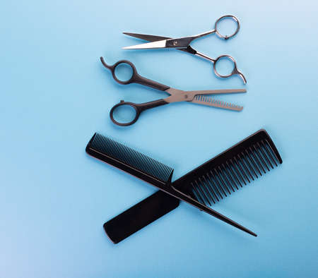 Professional tools for hairdresser isolated on blue background: hair combs and haircutting scissors. Hairdresser equipment for hairstyle in salon or barbershop concept